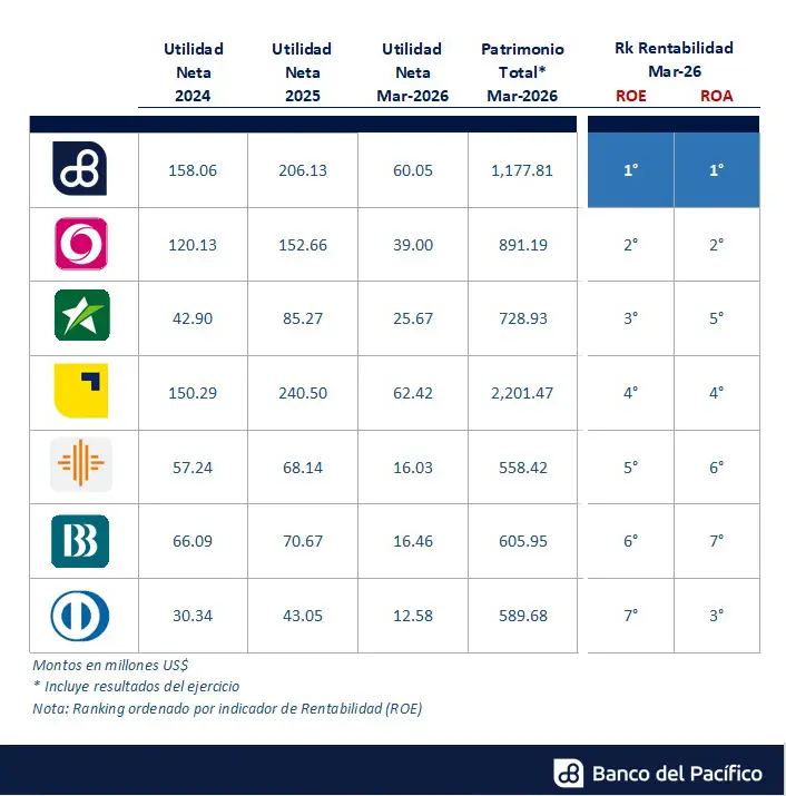 El Banco del Pacífico arrancó el año consolidando su liderazgo en el sistema bancario ecuatoriano, al ubicarse como la entidad con mayores niveles de rentabilidad del Sistema Bancario de Ecuador durante el primer trimestre de 2026, según cifras de la Superintendencia de Bancos.