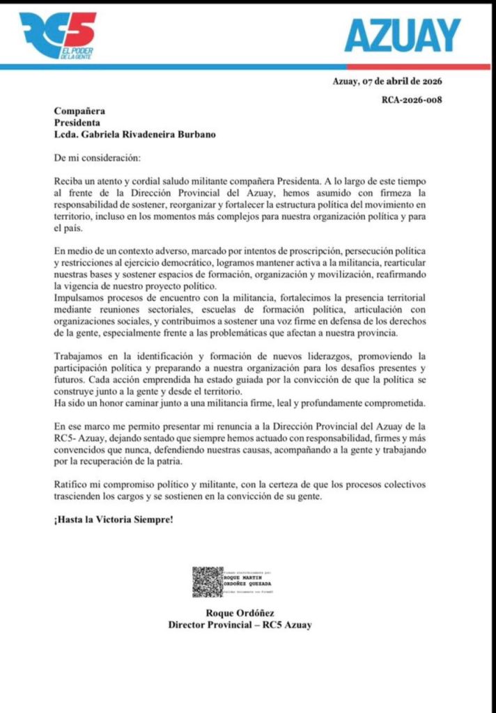 Mediante una carta oficial fechada el 7 de abril de 2026, Roque Ordóñez presentó su renuncia a la Dirección Provincial de la Revolución Ciudadana (RC5) en Azuay, cargo que desempeñó con el objetivo de fortalecer la estructura política del movimiento en la provincia.