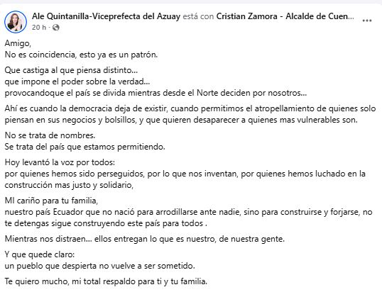 Viceprefecta del Azuay se solidariza con alcalde de Cuenca tras allanamiento